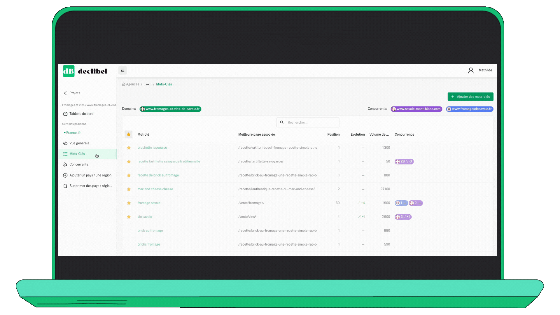 Connaître la position de vos mots-clés sur Google est essentiel pour évaluer votre visibilité et adapter votre stratégie de contenu. Deciibel offre un suivi quotidien des positions de vos mots-clés cibles afin de voir exactement où vous vous situez dans les résultats de recherche. Vous pouvez non seulement suivre vos propres mots-clés, mais aussi ceux de vos concurrents, ce qui vous permet de comprendre leur stratégie de référencement et d’identifier les opportunités pour les devancer.